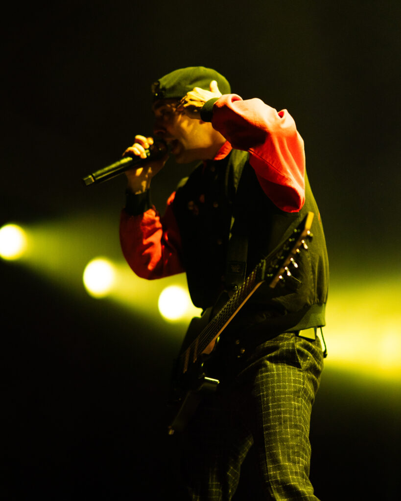 At 9:00 p.m., the lights dimmed and the venue roared with explosive excitement as Pierce the Veil stormed on stage. The band launched into “Death of an Executioner,” followed by the fan-favorite “Bulls in the Bronx.” From the first chord, their electrifying energy was undeniable. Lead singer Vic Fuentes commanded the spotlight, igniting the audience into a euphoric frenzy with his magnetic presence and raw vocals.